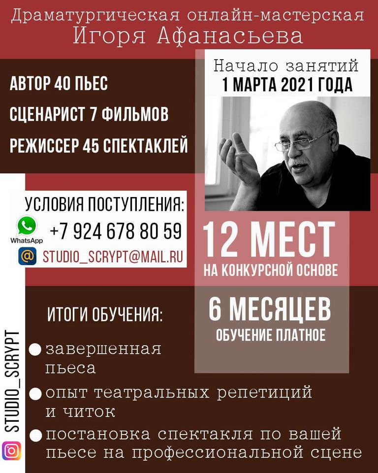 Студия «SCRYPT» открывает драматургическую онлайн–мастерскую Игоря Афанасьева